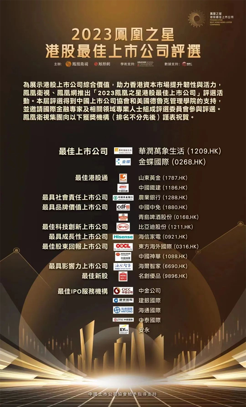 据悉,本次评选由凤凰卫视、凤凰网发起,同时得到中国上市公司协会和德鲁克管理学院的支持,评选重点关注企业在后疫情时代寻找新动能、创造新空间过程中的价值驱动及可持续发展力,通过对港股上市公司进行全方位、多维度的精准考量,遴选出综合水平最佳的上市公司。