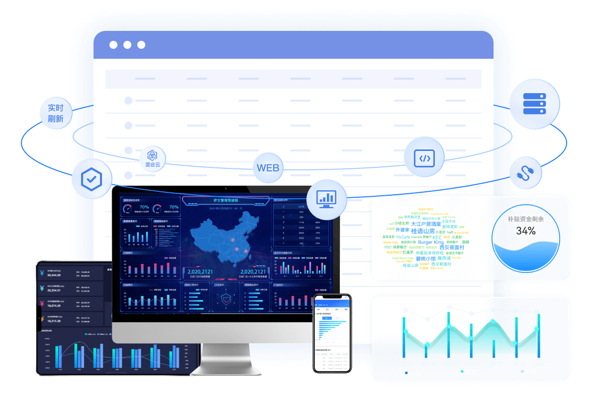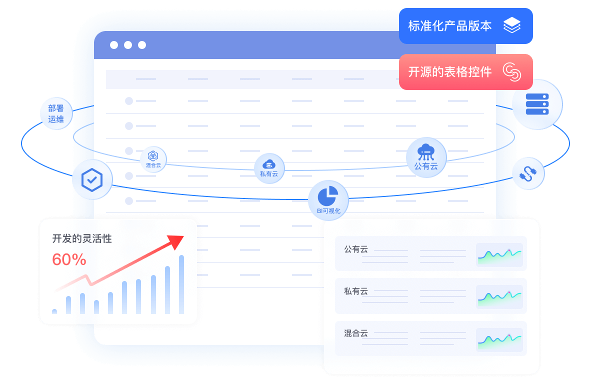 从报表工具到数字大屏工具,再到BI可视化工具,我们不但提供了标准化产品版本,还提供了开源的表格控件,并支持公有云、私有云以及混合云。