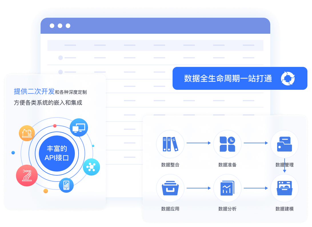 数据整合-数据准备-数据管理-数据建模-数据分析-成果应用;数据全生命周期一站打通;提供丰富的API接口,可提供二次开发和各种深度定制方便各类系统的嵌入和集成。