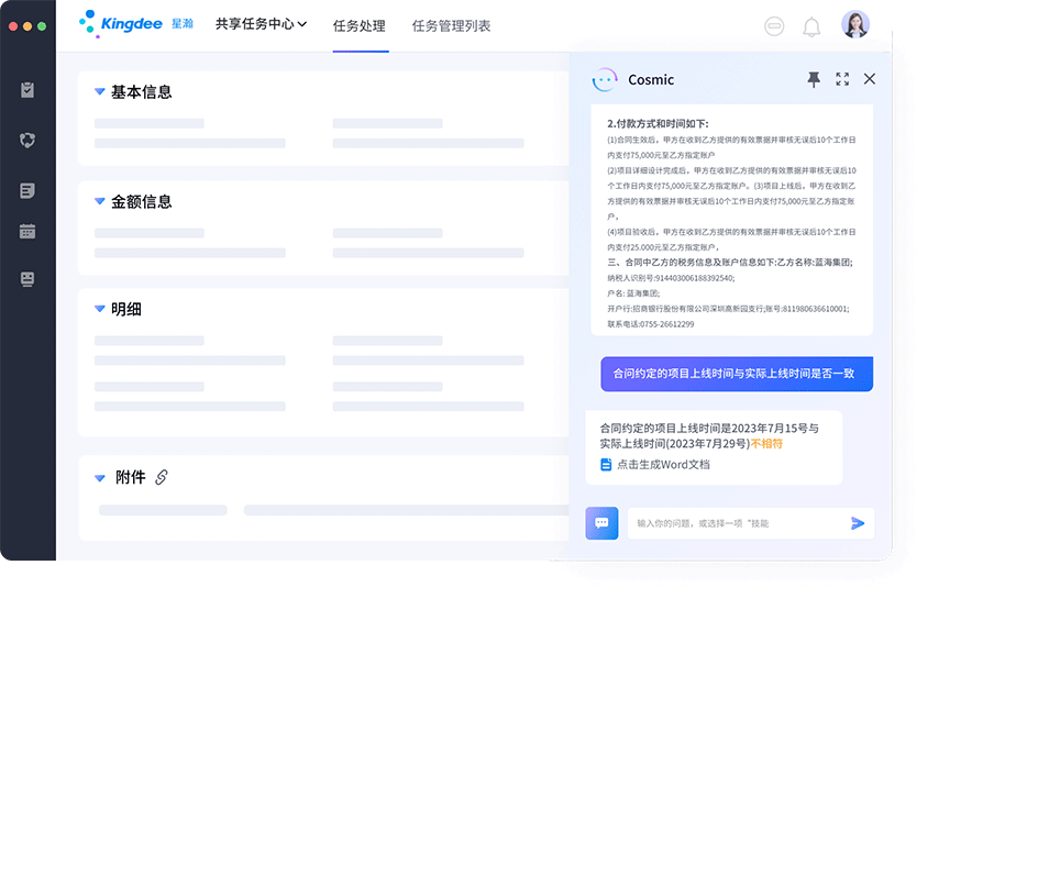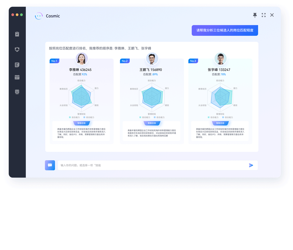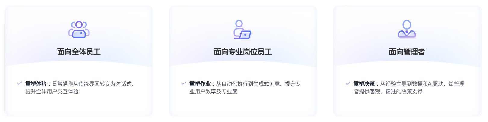 面向企业用户的超级智能AI管理助手,具备感知、记忆、思考和行动四大核心能力,能够智能地理解用户在财务、人力、采购、开发等场景需求,提供个性化的智能助手解决方案